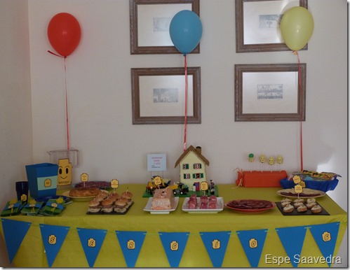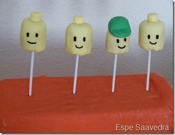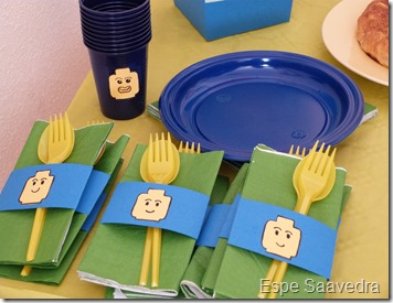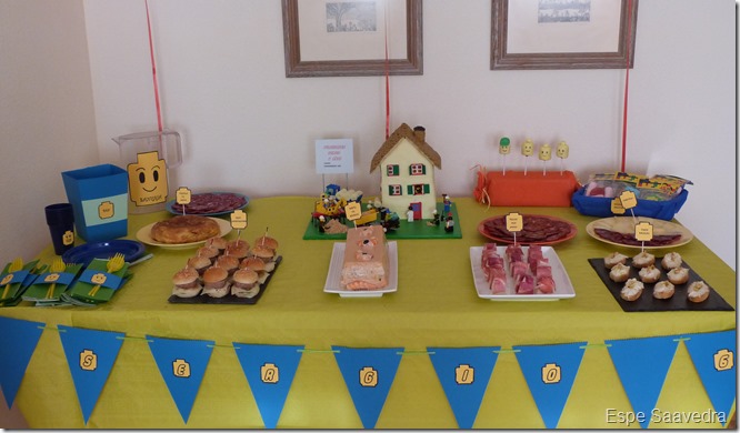 Era un self-service así que cada uno tomaba su plato, cubiertos y vaso y se iba sirviendo lo que le apetecía. Puse cartelitos en forma de cabezas de Lego donde ponía lo que era cada cosa. Como era una fiesta para peques y mayores hubo para todos los gustos: Tortilla de patata, Minihamburguesas, Pastel de salmón, Melón con jamón, Tostas de brandada fría de bacalao, Embutido: chorizo, salchichón, lomo y queso.
