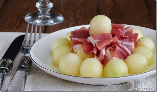 Simplemente es sacar las bolas del melón , cortar el jamón en trozos no muy grandes, y presentarlo de una manera chula.