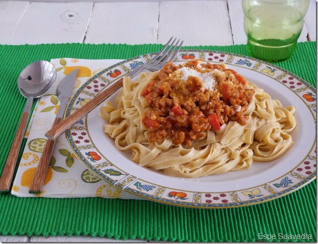Después solo tenemos que hervirla en abundante agua hirviendo con un poco de sal y servir con la salsa que más nos guste. En este caso la acompañamos con carne picada, hecha con un poquito de cebolla y pimiento rojo, tomate frito y un poquito de queso parmesano por encima.